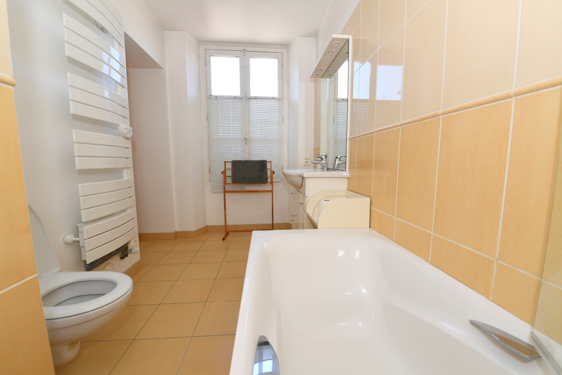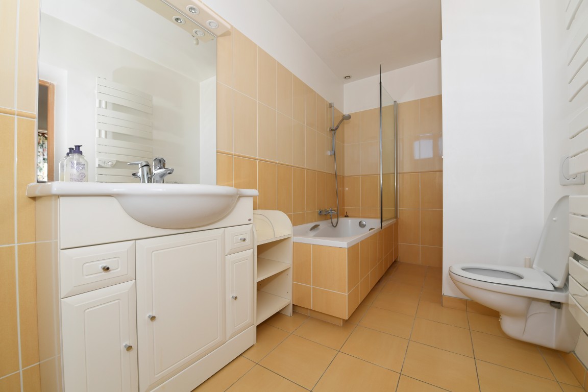 The en-suite bathroom has a washbasin, a bathtub with shower and private toilets.